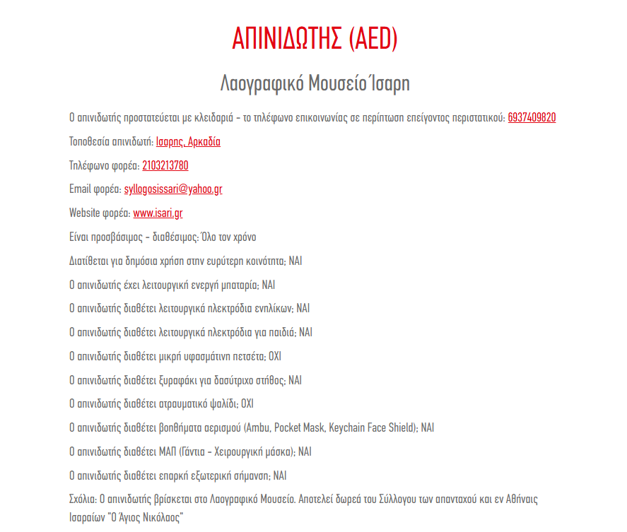 · Μεταφορά του από τον Ξενώνα και τοποθέτηση του απινιδωτή στο Λαογραφικό Μουσείο.